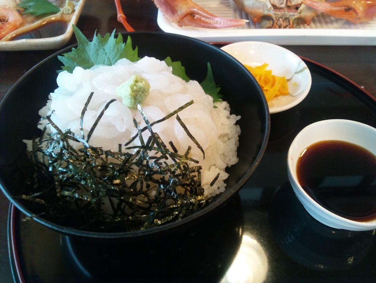 「富山湾の宝石」とも呼ばれている白エビを、富山産コシヒカリのご飯に惜しげもなく贅沢にのせてある「白エビ刺身丼」は、ほんの少しお醤油を掛けていただきます